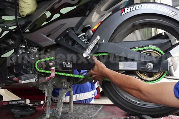 Anh em có thể kiểm tra bằng mắt thường để biết được độ trùng của sên, độ mòn của gai nhông. Và quan trọng là sên phải sạch sẽ, xịt dầu bôi trơn lên thì anh em mới dễ thấy được các vết nứt hay biến dạng của các mắt sên. Dựng chân chống đứng lên, quay bánh xe sau để kiểm tra chuyển động của sên và nhông có mềm mại không? Nếu sên có độ trùng và đã dão rất dễ gây tuột hay đứt xích nên thay thế ngay đi để chuyến đi phượt của mình an toàn hơn nhé.